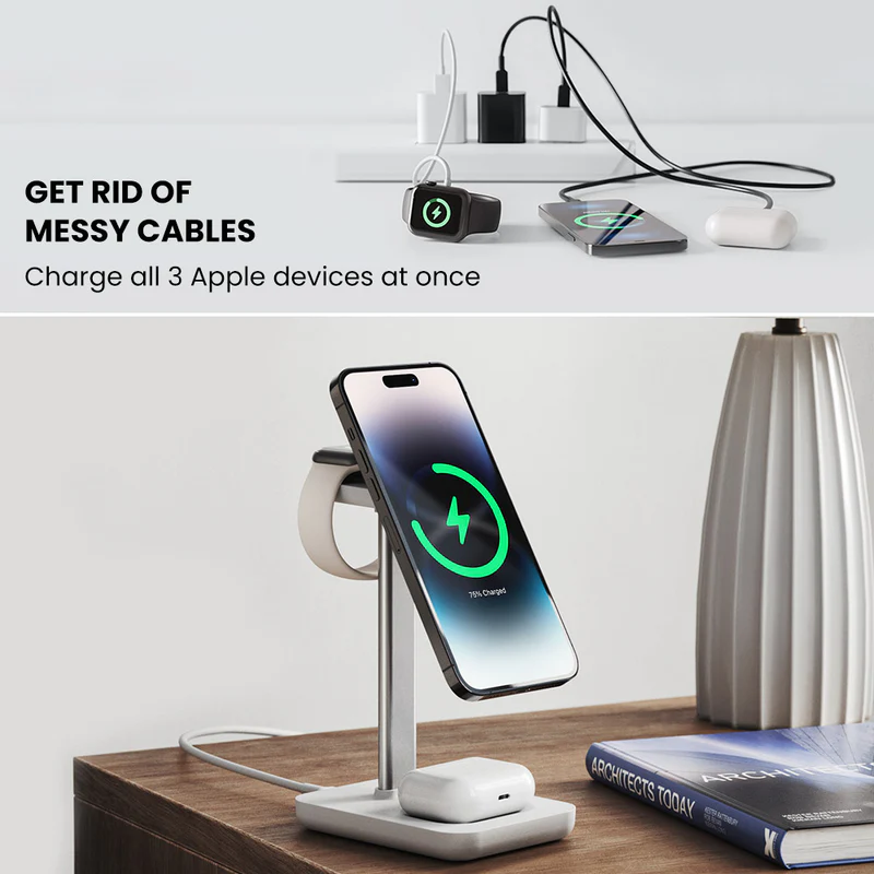 - Charges all 3 devices (iPhone 16/15/14/13/12; Apple Watch Series: 3-10, SE & Ultra 1/2; AirPods – Wireless Charging Models)at once- no extra cables required